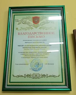 Наша школа МБУДО АРДЮСШ приняла участие в конкурсе «Мой волшебный Новый Год!» и была отмечена Благодарственным письмом администрации Александровского района.